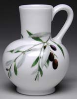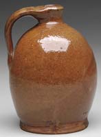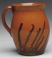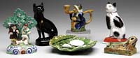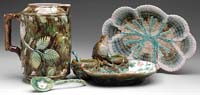 TRANSFER DECORATED LIVERPOOL PITCHER AND MUG. Mid 19th century. 1) Transfer decorated creamware pitcher with musical theme, the score for “Non Nobis Domine” between two ribbon tied musical trophy groups. 2) Creamware transfer decorated Liverpool mug of “JACK TAR” and “WAPPING LANDLADY”. SIZE: 1) 8-1/2″ h. 2) 3-1/2″ h. PROVENANCE: From the private collection of Dorothy-Lee Jones. CONDITION: 1) Spout with total restoration. 2) With some fleabites on rim and with small chips on base rim, minor loss to black transfer in hat of Jack Ta, otherwise very good. 9-23236-1 (1,500-2,000)