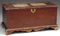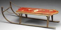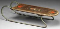 NEW ENGLAND PAINT DECORATED CHILD’S SLED. Late 19th century. Shaped seat in red paint decorated with a dainty floral spring within green borders, all joined to an iron frame. SIZE: 10″ h x 33″ l. CONDITION: Structurally good. Seat showing wear to painted surfaces within normal parameters. 9-22038 (400-600)