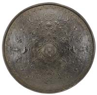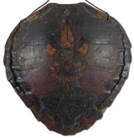 LARGE WEDGWOOD QUEENS WARE PLATTER IN ORIENTAL TASTE. Late 18th/early 19th century. The center decorated overall with floral sprigs, heron, insects and two fanciful turtles within a border of alternating pale green and cinnabar colored reserves, each decorated with a polychrome butterfly within flower heads. Impressed “WEDGWOOD”, also with the numeral “6” and mounted with a custom brass hanging frame. SIZE: 18-1/2″ dia. PROVENANCE: From the private collection of Dorothy-Lee Jones. CONDITION: Structurally good with overall wear to enameled surfaces and with light scratches within the center. 9-23256 (1,000-2,000)