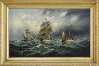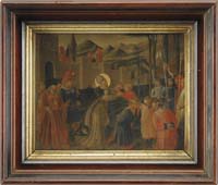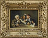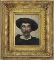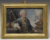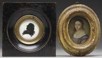 THREE MINIATURE PORTRAITS. Second quarter, 19th century for all. 1) An oval bust portrait of a young man on ivory with high collar and black cravat with dark hair, blue eyes and pronounced features. 2) An oval bust portrait on ivory of a younger man with white winged collar shirt, white cravat and stick pin. Mounted in a marbleized or grained frame of the period. The paper backing affixed to the backboard of the frame with illegible script, identifying the sitter. 3) A portrait of a mother and child. The woman in an empire, white lace dress with blue scarf. The portrait appears to be a paint-heightened transfer on porcelain, mounted within an oval gilt metal frame, decorated overall with floral garlands. Attached to the back of the frame backing is a handwritten label, “AFTER PAINTING SIG A. LAUVREU (?)..LADY DOVER”. SIZE: 1) 2-1/4″ h x 1-3/4″ w; 2) 2-1/2″ h x 2″ w; 3) 4″ h x 3-1/4″ w. PROVENANCE: From the private collection of Dorothy-Lee Jones. CONDITION: The first with some dryness to painted surface. The second is very good, frame is fair to good. The double portrait is generally very good, somewhat faded. 9-23220 (600-900)