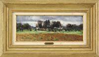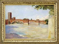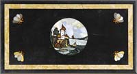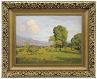 FRAMED INLAID WOOD CITY SCENE BY CHARLES SPINDLER (German, 1865-1938). The large panoramic town scene made with inlaid pieces of different woods & grains showing contrast between house roofs and walls with a hill background & trees. Signed lower right “C Spindler”. Housed in an antique wide dark frame. SIZE: 29-1/2″ x 43-1/2″. Overall: 38-1/2″ x 53″. CONDITION: Some cracking & lifting, otherwise good. 9-23462 (500-1,000)