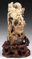 ROYAL WORCESTER DECORATED NAUTILUS SHELL. Circa 1887. Lavender back stamp and date mark for 1887 with an additional incised mark “X12”, additionally with name of retailer “Geo G. Shreve & Co. San Francisco”. The cream nautilus shell is surmounted by a lizard, supported by coral, surrounded by snails. Shell and foot are decorated with gilt. SIZE: 9″ h. CONDITION: Very good overall. 9-23479 (700-900)