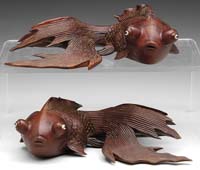 FOUR PIECES OF DECORATED ITALIAN POTTERY. Lot includes: Fine pair of 13″ Capodimonte ewers decorated profusely with cherubs including one on seahorse at base of spout, the central band including three on large fish. The ewers body held up by three mermaid type figures and having figural Satyr handle. The bottoms marked in blue with “N” and crown. Lot also having a pair of 12″ red parrot figurines, each having a paper label on base “Cacciapuoti Ceramiche E Gres D’Arte”. CONDITION: Very good. 9-22015 (800-1,200)