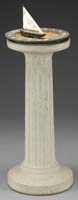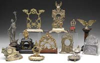 SEVEN MOLDED AMERICAN AND SANDWICH GLASS SINGLE CANDLESTICKS. 1) Two color dolphin Sandwich candlestick with green bobeche. 2 & 3) Two deep indigo molded candlesticks, one of the Eiffel tower. 4) Single translucent dolphin candlestick. 5) Ivory spiral twist candlestick with petal bobeche. 6) Neo-Classical figural candlestick. 7) Opaque pearl faceted candlestick. SIZE: Tallest: 10-3/4″ h. Shortest: 8″ h. PROVENANCE: From the private collection of Dorothy-Lee Jones. CONDITION: All very good with minimal flakes. 9-23261 (1,000-2,000)