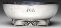 SHEFFIELD FOOTED CENTER BOWL. The round gadrooned bordered bowl having lion heads with ring handles and a center C-scroll flower decoration on a round base with flower design. Marked on base “England” with a lions head. SIZE: 7-3/4″ h x 10-1/2″ dia. CONDITION: Generally very good. 9-23146 (200-300)