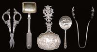 INTERESTING GROUP OF UNMARKED SILVER CREATURES. Lot includes a spitting hooded cobra; turtle; snail; bat; butterfly; dragonfly; praying mantis; salamander; centipede; and spider. SIZE: Tallest: 3-1/2″. Longest: 3-3/4″. CONDITION: Very good, dragonfly has creased wing. 9-21837 (200-400)
