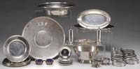 12 STERLING BULLION SOUP FRAMES WITH 8 LENOX INSERTS. The matched set of frames having reticulated sides and two scroll handles. Bottoms marked “Sterling” with hallmark of the Watson Company of Attleboro, MA., circa 1905-1929. Also marked “29-1/2”. Along with eight gold band cream color bullion inserts by Lenox. WEIGHT: 24 tr. oz. SIZE: Inserts: 4″ dia. PROVENANCE: From the private collection of Dorothy-Lee Jones. CONDITION: Very good. 9-23231 (400-600)