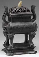 THREE PIECES OF WEDGWOOD ROSSO ANTICO. Last quarter 19th century. Comprising a paneled milk pitcher with enamel floral decoration, and a Dragon Kenlock ware cup and saucer with enameled dragon, insect and Foo Dog decoration. All three pieces are impressed on the underside “Wedgwood”. SIZE: Pitcher is 6-1/4″ h. Cup is 3-1/2″ dia. Saucer is 5-3/4″ dia. PROVENANCE: From the private collection of Dorothy-Lee Jones. CONDITION: Very good overall with slight soiling. 9-23349 (200-300)