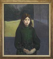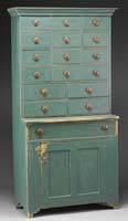 PAINT AND STENCIL DECORATED CHILD’S SLED. The unmarked example painted in green with decorations of scrolling cartouches and decorated with bust of a dog. SIZE: 11-1/2″ h x 32-1/4″ l. CONDITION: Sled retains original painted and decorated surfaces. Steel capped runners intact. No breaks or restorations noted. 9-22040 (300-500)