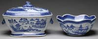GROUP OF WEDGWOOD AND ENGLISH TEA WARES. Late 18th & 19th century. A shaped feather edge serving dish with scrolled handle impressed “WEDGWOOD” and additionally impressed with a “B”. A pair of lavender transfer-decorated cups and saucers with fanciful peacocks, each cup applied with strap handle and signed “WEDGWOOD” with a mixture of capital and lower case letters (1759-1800). A Wedgwood cup and saucer molded with vinery in an ivory glaze with gilded borders from the Levy Collection. A Swansea scenic paint decorated cup and saucer of English manor houses, gilt decorated and with blue borders. Two blue and white decorated cups and tea bowls in underglaze-blue of Oriental taste, gilt decorated. SIZE: 9″ x 7-3/4″ (plate). PROVENANCE: From the private collection of Dorothy-Lee Jones. CONDITION: The first with rim chips. The second group with a chip to one cup and with shallow rim chips to saucers, otherwise good. Cup and saucer with vinery with minor gilding losses to rim, otherwise very good. Swansea cup and saucer very good. The cups and tea bowls overall very good with slight roughness to scalloped rims of saucers. 9-23350 (400-600)