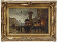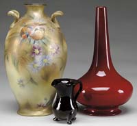 W.G. & CO. LIMOGES BALUSTER VASE. Late 19th century. Made by Limoges porcelain company of William Guerin and so marked in underglaze green beneath base. Also painted with artist’s initials “E.C.H/’98”. Decorated overall with large floral arrangement in pink, peach and yellow pastels, with gilt decorated top and bottom base rims and at foot and collar. SIZE: 21-3/4″ h. CONDITION: Very good. 9-22574 (400-600)