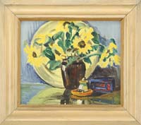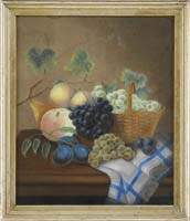 OIL ON PANEL OF CORN IN STYLE OF MONTGOMERY. Last quarter 19th century. Depicting a sheaf on Indian corn, painted on a walnut board with chamfered edges. SIZE: 22″ h x 9-3/4″ w. CONDITION: All original with some light horizontal scratches across surface through middle third. Otherwise very good. 9-23380 (400-600)