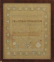 NEW ENGLAND SILK ON LINEN SAMPLER OF SALLY “SHEPLEAFED”, JULY 7, 1811. Wrought with three rows of alphabet in capital and lower case above a line of Arabic numerals in dark brown followed by two rows of the alphabet in script followed by four lines of verse which read “Youth’s the springtime of our years/Short the rapid end appears/Let’s improve the fleeting hours/Virtue’s noblest fruits be ours” stitched in shades of light blue and brown followed by a line stitched with her name and date the quilt was completed. The bottom a pictorial line of a fruit tree flanked by a flower stem and a tree full of birds all within a zigzag border further surrounded by a zigzag and acorn border in blue and cream silk, all within a S-scrolled outer border. SIZE: Sight: 18-3/4″ x 16″. PROVENANCE: From the private collection of Dorothy-Lee Jones. CONDITION: The linen ground with overall staining from acid backing resulting in overall fading of silk threads in tones of brown. 9-23200 (500-800)