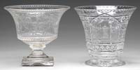 TWO CUT GLASS URN SHAPED VASES. Late 19th/Early 20th century. 1) This clear crystal example is engraved with Oriental influenced scenes with bamboo, herons and small temples. Signed beneath the lower border in script “W. Fritsche”. 2) Similar example engraved with scrolling cartouches of leaf tips interwoven with floral garlands and swags on a square footed base. SIZE: Each are 6-1/2″ h. PROVENANCE: From the private collection of Dorothy-Lee Jones. CONDITION: Both are very good with each having wear to the underside of foot from use. 9-23257 (800-1,200)