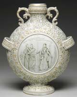WEDGWOOD QUEENSWARE COPPER COATED CUP. Circa 1930-35. Cup decorated overall with neoclassical scenes and coated with thin molded sheet of copper. Base impressed “WEDGWOOD”. SIZE: 2-3/4″ h x 3″ dia. PROVENANCE: From the private collection of Dorothy-Lee Jones. CONDITION: Very good color and patina. Slight lifting of metal sheathing around rim. With old hairline cracks running vertically downward from lip. Otherwise very good. 9-23337 (500-1,000)