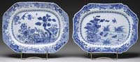 THREE WEDGWOOD PLATES OF ORIENTAL DESIGN. Circa 1871-1872. A pair of octagonal transfer decorated plates with a molded diaper work border with impressed mark on the reverse and additionally marked with the retailers backstamp “JOHN MORTLOCK POTTERY GALLERIES LONDON”. The third, a round example, similarly decorated with impressed mark and date stamp. The transfer decorations are of wood block prints. SIZE: 9″ dia. PROVENANCE: From the private collection of Dorothy-Lee Jones. CONDITION: Each with wear to transfer decoration, otherwise structurally sound. 9-23266 (400-600)