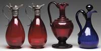 GROUP OF COLORED GLASS CRUETS. Late 19th/Early 20th century. 1) Ruby red example with tri-corner spout. 2) Pair of cranberry ewers with silver-plated mounts. 3) Deep indigo example with applied scrolled handle and conforming indigo stopper. SIZE: Tallest is 9-1/2″. PROVENANCE: From the private collection of Dorothy-Lee Jones. CONDITION: All pieces are very good. 9-23315 (800-1,200)