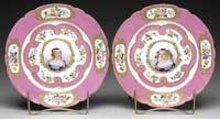 WEDGWOOD PLATE TOGETHER WITH PAIR OF BASALT INKWELLS. Late 19th century. Plate with central putti on lilac ground within main border of floral swags on celadon ground impressed “WEDGWOOD”; jasper inkwells marked with impressed “C”. SIZE: Plate: 6-1/2″ dia. Inkwells: 2-3/4″ dia. PROVENANCE: From the private collection of Dorothy-Lee Jones. CONDITION: Very good overall. 9-23345 (200-400)