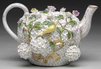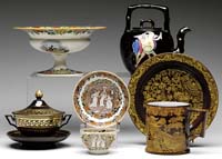 TWO ENGLISH WEDGWOOD CREAMWARE MOLDED TEAWARES AND A BLACK ENAMEL TEAPOT. Late 18th/early 19th century. The matching Creamware teapot and creamer molded with columns, acanthus and water leaves, each with a light Wedgwood blue enameled rondel centering a silhouette. The black teapot of similar unmarked design, decorated with a central mourning scene, flanked by square columns and urns. SIZE: Teapots 6-1/2″ h each, creamer 4″ h. PROVENANCE: From the private collection of Dorothy-Lee Jones. CONDITION: Creamware teapot and creamer with minor flecks and roughness to end of spouts and the teapot with small chips overall. The black example with a chip on rear of top rim, otherwise very good. 9-23333 (400-600)