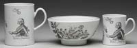 TWO WORCESTER “KING OF PRUSSIA” TRANSFER DECORATED CUPS AND WORCESTER BOWL. 19th century. 1& 2) Worcester mugs with molded handles transfer decorated with half profile bust of King of Prussia beneath putti in act of bestowing laurel wreath. Figure pointing to large military trophy with banners identifying various victories. The whole trumpeted by an angel. Beneath trophy is mark of Robert Hancock, Worcester and dated “1757” beneath portrait. 3) Bowl decorated overall with Classical pastoral scenes. Signed with mark of Robert Hancock, Worcester beneath an urn. SIZE: Smaller” 3-1/4″ h. Larger: 4-1/2″ h. Bowl: 3″ h x 6″ dia. PROVENANCE: From the private collection of Dorothy-Lee Jones. CONDITION: Smaller cup with repair to handle, otherwise good. Larger cup with glaze imperfection at midpoint between putti, portrait and portrait, otherwise very good overall. Bowl with shallow rim chip, otherwise very good. 9-23348 (500-600)