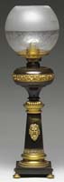 TWO TABLE LAMPS & LEATHER BOX. A turned marble table lamp; the other a folk art type inlaid wood table lamp. The square hat-type box in heavy leather having an embossed name “A. McDonald Maker 16 Beacon St. Boston”. Having a brass lock marked “Eagle Lock Co.”. A heavy leather handle and lined interior. SIZE: Lamps: 19″ and 21″. Box: 11″ h x 13-1/2″ w x 11-1/2″ d. CONDITION: Lamps need re-wiring. Inlaid lamp with cracks. Leather box having wear to edges, a stuck label on one side, shows use. 9-22786 (50-100)