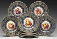 TWO SETS OF ENGLISH DECORATED LUNCHEON PLATES. First half 20th Century. The first, a set of ten 9″ painted and transfer decorated Wedgwood luncheon plates. Pattern number W9959. The second set of eleven, Copeland Spode 8-1/2″ luncheon plates decorated with a central floral filled basket within a light blue/gray band decorated with embossed floral sprays. Retailed by Tiffany & Co., New York. Pattern number R7981. SIZE: As noted above. PROVENANCE: Woolworth Estate (F.W. Woolworth Dept. Store). CONDITION: Wedgwood plates with minor flecks on rim edges. The Spode plates very good overall with no imperfections noted. 9-21382 (100-200)