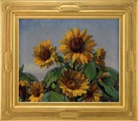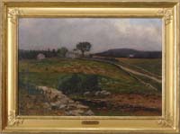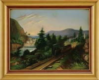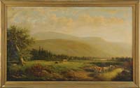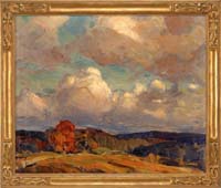 EMILE ALBERT GRUPPE (American, 1896-1978) MT. MANSFIELD, VERMONT. Fine oil on canvas early work shows a rocky mountain with smaller hills and a farm with rock strewn grassy hillside. All under a blue and white cloud sky. Signed lower right. Housed in a replacement gilt frame with linen liner. SIZE: 18” x 20”. CONDITION: Very good. 9-74714 LG (7,000-10,000)