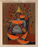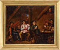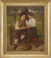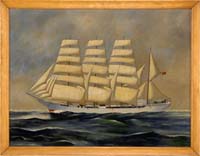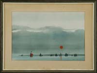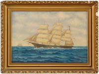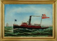 EMILE ALBERT GRUPPE (American, 1896-1978) “HAULING THE NETS”. Oil on canvas scene shows eight men in a small boat off a large schooner hauling in the net which is full of fish and being unloaded onto the schooner deck. Another schooner is seen in back with another small boat. Signed lower right. Housed in its original silver gilt carved wood frame. Title and dated “1975” on reverse. This scene was a popular subject for Gruppe and was revisited many times. Accompanying the painting is a small Gruppe biography which its cover displays a similar work. SIZE: 25” x 30”. CONDITION: Very good. 9-90579 LG (8,000-12,000)