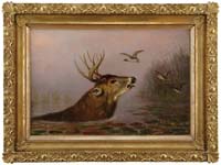 ARTHUR BURDETT FROST (American) “ORDER OFF”. Framed print shows a farmer telling a hunter and his dogs to move off his property. All in a summer landscape. Signed in the print “AB Frost 1903”. Housed in a black and partial gilt wood frame with wide white matte. PROVENANCE: Rankin Estate, Annapolis, Maryland. SIGHT SIZE: 10-3/4” x 16”. CONDITION: Foxing with one small water stain to the right corner. 9-29682 SM (50-100)