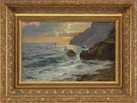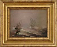 WILLIAM LESTER STEVENS (American 1888-1969) OFF PIGEON COVE. Oil on board coast line scene shows waves crashing on coastal rocky ledge with sailboats on water beyond and hillside shore beyond. Signed lower left “W. Lester Stevens N.A.”. Housed in a gesso gold decorated frame (as is). SIZE: 12” x 16”. CONDITION: Discolored varnish layer and surface dirt. There is a 1” chip in center that has been varnished over. Otherwise good. 9-90285 SM (2,500-3,500)