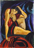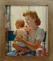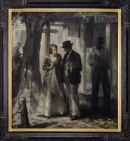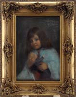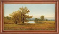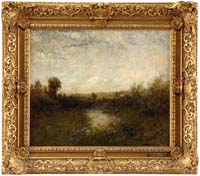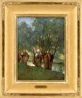EMILE ALBERT GRUPPE (American, 1896-1978) NUDE AT WOODLAND POOL. Fine large oil on canvas scene shows a nude woman standing with back to viewer at the edge of a woodland pool. She holds a shear cloth over the lower half of her body. Deep blue colored pool has light shining down on colorful woods edge. Signed lower right. Housed in a fine carved modern gilt frame with gilt name plaque. PROVENANCE: Fine private Long Island, New York mansion. SIZE: 37” x 24-1/4”. CONDITION: Very good, relined on new stretcher. 9-73994 FP (8,000-12,000)
