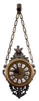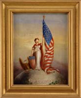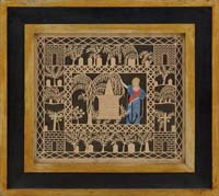 SOUTH AMERICAN ENAMELED ICON WITHIN A HAMMERED AND CHASED SILVERED METAL FRAME (19th Century). The oval enameled plaque depicting haloed Christ rising from the tomb, polychrome painted. Mounted in a conforming and scrolled floral molded frame headed by a sunburst. Indistinct hallmarks along frame base. SIZE: 7-1/4”h x 5-3/4”w. CONDITION: Overall good with minor wear to paint, frame with some creasing. 9-74607 SM (250-400)