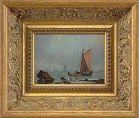 JAMES JEFFREY GRANT (American, 1883-1960) LOBSTER SHACK, EAST GLOUCESTER. Oil on canvasboard summer scene shows three men working at dock in boat next to a red fishing shanty. A two-mast schooner in full sail sailing right to left through Gloucester Harbor with buildings in the background. Signed lower left “J Jeffrey Grant”. Housed in a modern carved wood gilt frame. SIZE: 16” x 14”. CONDITION: Very good. 9-90216 MD (3,000-5,000)