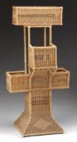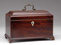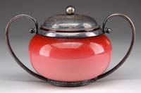 THREE SILVER PLATED FRAMED CRANBERRY GLASS TABLE ARTICLES. 1) 4-3/4” h Reed & Barton silver plated framed creamer. Creamer having an open center area with three Roman/Greek oval bust profiles of men with helmets. Three scroll pad feet. Removable cranberry glass liner which has a repair and chips to rim. 2) 4-1/2” h (without handle) unmarked silver plated frame swing handled jar. Open work frame having heart and tassel decoration, a key border, all supported by three claw feet and having a swing handle. Removable cranberry glass liner. 3) 3-1/2” h x 4-1/2” dia. swing handled sugar bowl. Open work bowl with rod and ball decoration has a pointed shield applied front with no monogram. Removable cranberry glass liner. Liner does not fit snuggly. PROVENANCE: From a fine southern Maine home. CONDITION: As noted above, otherwise good. 9-74400 SM (250-400)