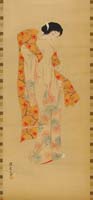 JAPANESE HAND PAINTED WALL SCROLL, LATE EDO PERIOD. On blue and gold silk, with the hand painted design of butterflies by Shien Murata and with love poem inscription by Tamechika Reizei. PROVENANCE: Murata and Reizei revived the Japanese traditional paintings which has been continued by members of the Tosa and Sodatsu & Rinpa school from Heian period to the beginning of Edo period. SIZE: 46-1/4”l x 29-1/2”w. CONDITION: Overall very good with some creasing in silk, some water staining in upper panel. 9-90014 MD (75-150)