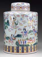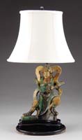 GOOD DECORATED GINGER JAR TABLE LAMP. Large jar having a scene of men and warriors in front of Emperor. Several deities are seen in clouds. Mounted on a wood leaf type base with double light fixture and shade. PROVENANCE: Fine private Long Island, New York mansion. SIZE: Vase is 10-1/2” h; 30” total h. CONDITION: Generally very good. 9-73998 SM (200-400)