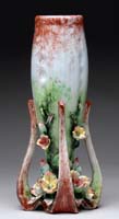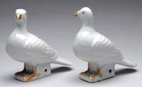 PAIR OF DECORATED MILK GLASS VASES. Decorated in the Meissen style with a blue ground, each decorated with a bird, fan, painting, daisies. PROVENANCE: Fine private Long Island, New York mansion. SIZE: 12” h x 8” at widest. CONDITION: Some minor rubs, very good. 9-74065 SM (400-800)
