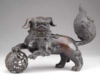 ORIENTAL CARVED JADE FOO DOG ON STAND IN ORIGINAL FITTED CASE, 20TH CENTURY. The well articulated carving of the dog depicted in a partially seated position. PROVENANCE: Fine private Long Island, New York mansion. SIZE: 6-3/4”h x 6-1/4”l. CONDITION: Very good overall with original surfaces. 9-73916 SM (300-500)