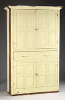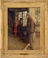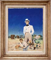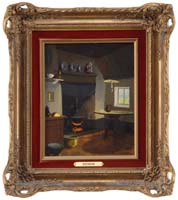 OTIS PIERCE COOK JR. (American, 1900-1980) READYING THE TRAPS. Outstanding large oil on canvas scene shows a man handling a lobster trap in a lobster boat which is on dry beach during low tide. Seagulls fight after some cast offs and a mooring post has lobster pot beside. Signed bottom right. Housed in a fine modern gilt frame. SIZE: 30” x 36”. CONDITION: Very good. 9-90314 LG (5,000-8,000)