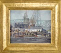 EMILE ALBERT GRUPPE (American, 1896-1978) “GLOUCESTER HARBOR IN EVENING LIGHT”. Outstanding oil on canvas Gloucester, Massachusetts scene shows several boats in a harbor with docks and low hills lined with houses. Pink reflected sunset on the edges of white clouds and blue sky. Signed lower right. Housed in a fine modern arts & crafts style carved gilt frame. Titled on back of stretcher and also on front artist plaque. REFERENCE: For similar painting see page 67 of “Gruppe on Painting 1976”. SIZE: 25” x 30”. CONDITION: Very good to excellent. 9-74479 FP (12,500-17,500)