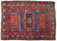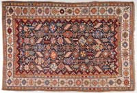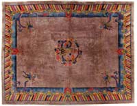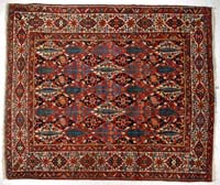 WOVEN RUG OF NATIVE AMERICAN DESIGN. Depicting stylized pine trees in alternating rows of greens, red, and tan within a red border of geometric devices. PROVENANCE: Fine private Long Island, New York mansion. SIZE: 8’8” x 6’. CONDITION: Very good overall. 9-74181 SM (200-400)