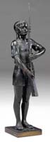 F. PARISI (First half of the 20th Century) YOUNG SOLDIER. Bronze figure of a young boy wearing a fez type hat holding a WWI vintage rifle with bayonet in front of chest at attention. Signed on base “F. Parisi”. SIZE: 27-3/4” h. CONDITION: Very good. 9-74299 MD (1,000-1,500)