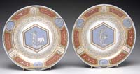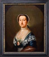 TWO CONTINENTAL HAND PAINTED PORTRAIT PLATES. Mid 19th Century. 1) 6-1/4” dia 3/4 view of a woman with dark wavy hair, amber earring and necklace in a white blouse gazing to the left. 2) 6” dia profile of a female figure with embroidered shawl and blue collared vest wearing a gold cross. Each mounted in a velvet lined frame. CONDITION: Plates very good condition, original surface; frames worn. 9-74926 MD (200-400)