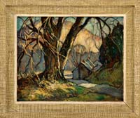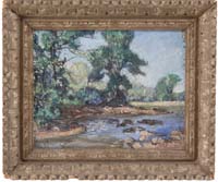 WILLIAM LESTER STEVENS (American 1888-1969) MOUNTAIN ROAD – HAWLEY. Oil on masonite scene shows a Western Massachusetts landscape with a road, large tree, houses and a hill/mountain backdrop. Signed lower right “W. Lester Stevens N.A.”. Housed in its original decorated wood frame having an attached card from The Gallery, 16 Main St., Amherst, MA. A fine example from his best impressionistic period. PROVENANCE: A copy of a brochure of the exhibit of Steven’s work at the Gallery Amherst where this painting was purchased accompanies this lot. SIZE: 16” x 20”. CONDITION: Very good. 9-90263 MD (4,000-6,000)