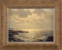 CARL WILLIAM PETERS (American, 1897-1980) SKY, ROCKS AND SEA. Oil on canvas shoreline scene shows small waves cascading onto a rocky beach with rocky shoreline beyond. Small sailboat is seen on the horizon. Signed lower right. Housed in a fine replacement silver gilt frame with white liner. SIZE: 20” x 24”. CONDITION: Very good with minor edge touch up. 9-74352 MD (4,000-6,000)