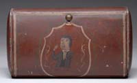 FRAMED “POLARINE” MOTOR OIL SIGN. The sign painted on oilcloth reads, “Polarine, the perfect motor oil” in gold and red letters. Housed in an antique grain-painted wood frame. SIGHT SIZE: 15-1/4” x 34-1/2”. CONDITION: Good with small touch up and creases with inside tear to right corner. 9-74929 SM (500-1,000)