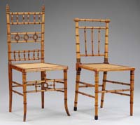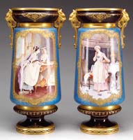 PAIR OF OUTSTANDING PORCELAIN VASE TABLE LAMPS. 19th Century Continental French style vases have a bulbous shape with front round hand painted scene, one having musical motif with flowers and the other with rakes, hay, bonnet and tambourine. Vases have a blue background and are adorned with applied colorful flowers and leaves. Gilt handles have griffin head decoration. Fancy metal base with two socket light fixture. PROVENANCE: Fine Bangor, Maine mansion. SIZE: Vase is 15” h. 32-1/2” total h. CONDITION: Some gold rubs and chips to flowers and a repair/repaint to edge of base. Generally good. 9-74214 SM (500-1,000)