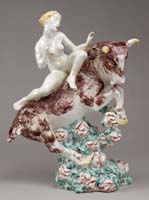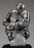GUSTEL MORTON (AMERICAN, 1902-?) TERRACOTTA FIGURE OF A CLOWN WRESTLING A SEAL. Depicting a smiling clown with peaked hat wrestling a seal while perched on a ball. The surface in a mottled finish. Signed indistinctly around bottom rim in faded black paint. SIZE: 21-1/2”h. CONDITION: Good original surfaces and color. Old chip on clowns pant cuff. 9-74604 SM (500-750)