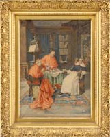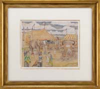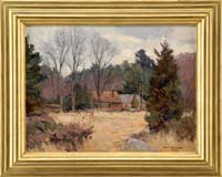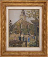 WILLIAM LESTER STEVENS (American 1888-1969) HILL TOWN CHURCH. Tempera on masonite western Massachusetts scene shows a church with out-buildings nestled amongst trees with rounded hilltop background. A late fall scene in one of the small Berkshire hill towns. Signed lower right “W. Lester Stevens N.A. A.W.S.”. Housed in a gray painted wood frame with white interior. PROVENANCE: A Xerox copy of a brochure of the exhibit of Steven’s work at the Gallery Amherst where this painting was purchased accompanies this lot. SIZE: 15-3/4” x 20”. CONDITION: Surface dirt. Very good. 9-90300 MD (3,000-5,000)