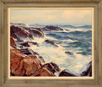 EMILE ALBERT GRUPPE (American 1896-1978) “MORNING BASS ROCKS”. Large oil on canvas scene shows waves crashing onto rocky coastline. A classic scene for this Rockport/Gloucester artist. A nice rendition of this popular spot. Signed lower left. Housed in its original green washed molded wood frame with white liner. Title and artist on back stretcher also date “1964”. Acquired directly from the artist. PROVENANCE: Accompanying the painting is the original typed receipt from Emile A. Gruppe Gallery dated July 2, 1964. SIZE: 25” x 30”. CONDITION: Very good, some discolored varnish, would clean up nicely. 9-74680 LG (6,000-8,000)